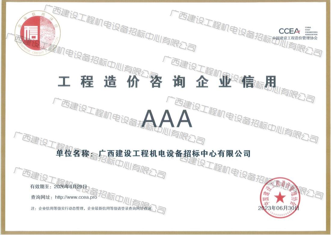 中國建設工程造價管理協(xié)會工程造價咨詢企業(yè)信用AAA等級