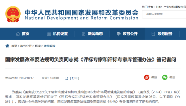 近日,國家發(fā)展改革委修訂印發(fā)了《評標專家和評標專家?guī)旃芾磙k法》(國家發(fā)展改革委令第26號,以下簡稱《辦法》)。 圍繞社會各界關(guān)注的問題,國家發(fā)展改革委法規(guī)司負責同志就《辦法》有關(guān)情況回答了記者的提問。